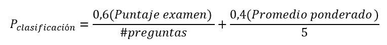 - Luego, en ese orden, se escogerá al estudiante con el mejor puntaje ponderado de clasificación por universidad, el cual será calculado de la siguiente manera: